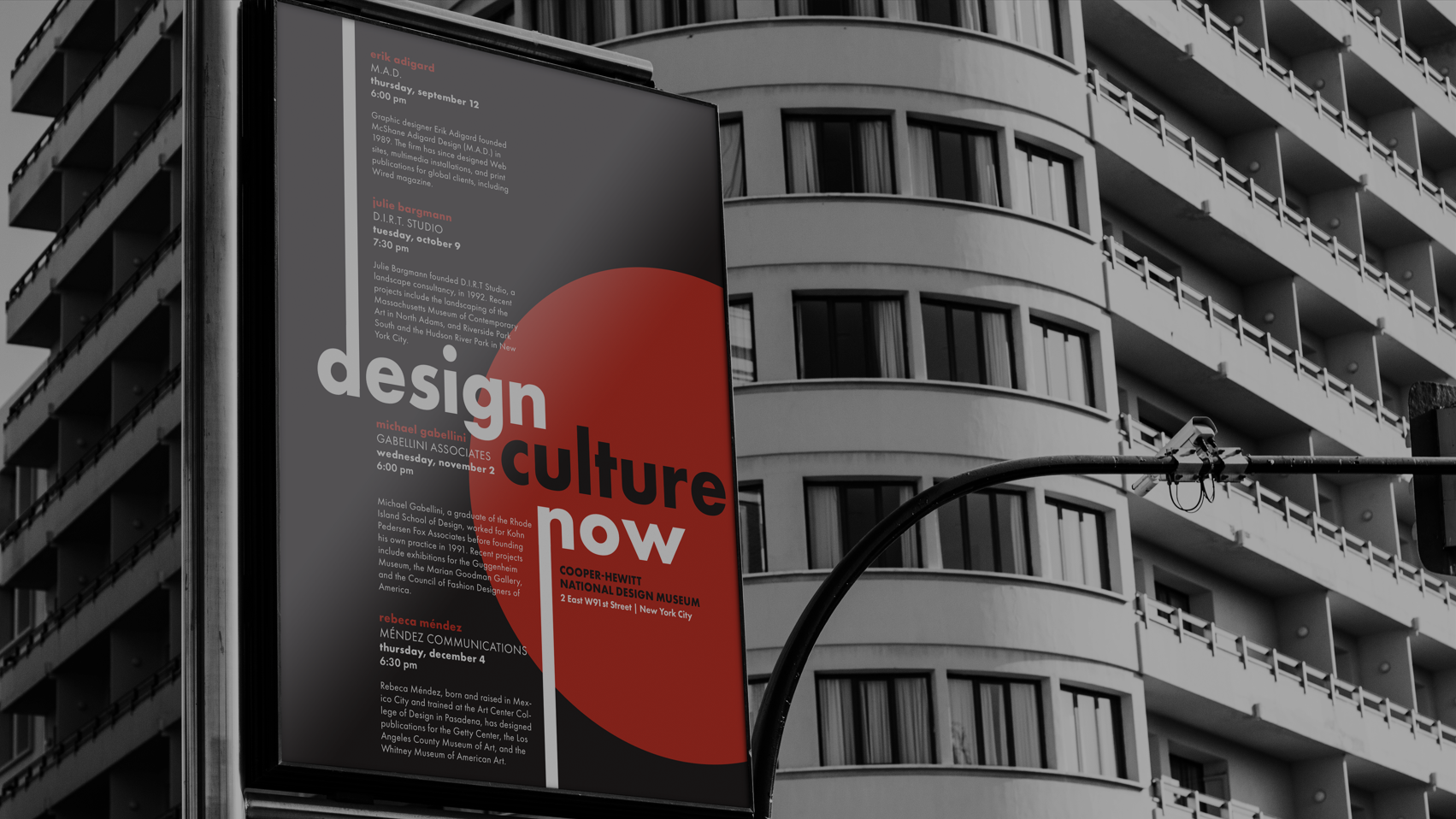 When brainstorming for this project, I started by thinking about what the phrase “Design Culture Now” meant to me. The words “collaborative”, “innovative”, and “diverse” came to mind quite often, since that is how design has evolved over time. Once I had those words, the next step was to figure out how to best represent them in my design. I wanted to create a design that was minimalist and would not look out of place in the Smithsonian museum. I also tried to avoid dated fonts to signify any particular time.